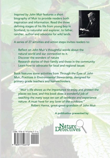 Inspired by John Muir features a short biographic profile of Muir to provide both reader information and inspiration. Read the three defining stages of his life from young boy in Scotland to wandering naturalist and explorer, to father, rancher, author and advocate for wild lands. A series of 27 activities and action steps follow the bio inviting readers to:- Reflect on John Muir's thoughts and inspiring quotationsabout the natural world and our connection to it.- Discover the wonders of nature on their own- Research stories of their family and those in the community- Learn how to advocate for local and regional issues Many activities are also featured in the book Through the Eyes of John Muir, Practices in Environmental Stewardship, designed for primary grade teachers and home schoolers.