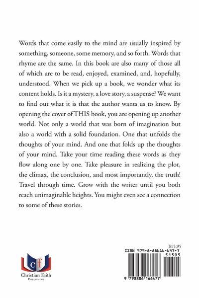 Words that come easily to the mind are usually inspired by something, someone, some memory, and so forth. Words that rhyme are the same. In this book are also many of those all of which are to be read, enjoyed, examined, and, hopefully, understood. When we pick up a book, we wonder what its content holds. Is it a mystery, a love story, a suspense? We want to find out what it is that the author wants us to know. By opening the cover of this book, you are opening up another world. Not only a world that was born of imagination but also a world with a solid foundation. One that unfolds the thoughts of your mind. And one that folds up the thoughts of your mind. Take your time reading these words as they flow along one by one. Take pleasure in realizing the plot, the climax, the conclusion, and most importantly, the truth! Travel through time. Grow with the writer until you both reach unimaginable heights. You might even see a connection to some of these stories.