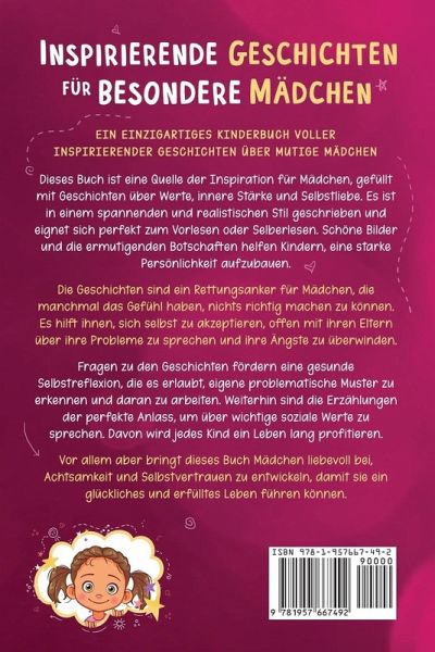 Hallo du! ¿¿¿¿ Warte kurz. Ich wollte dich schnell etwas fragen: Weißt du, dass du etwas ganz Besonderes bist? Es gibt Milliarden von Menschen auf dieser Welt, aber dich gibt es nur einmal. Du bist absolut einzigartig und das solltest du dir immer vor Augen halten! Die Welt ist voller kleiner und großer Probleme und manchmal denkst du vielleicht: "Das schaffe ich nicht!" ¿¿¿¿ Vielleicht bekommst du Angst oder zweifelst an dir selbst. Aber an dieser Stelle möchte ich dir ein Geheimnis verraten: Jeder fühlt sich manchmal so! Sogar die Erwachsenen. ¿¿¿¿ In diesem Buch wirst du starke Mädchen kennenlernen, die sich diesen Herausforderungen gestellt und sie überwunden haben. Sie werden dich dazu inspirieren, das Gleiche zu tun! In diesem Buch geht es um Mädchen, die lernen, an sich selbst zu glauben. Am Anfang sind sie ängstlich und unsicher, aber schließlich finden sie den Mut, sich ihren Ängsten zu stellen. Manchmal zweifeln sie an sich selbst, aber am Ende entdecken sie, dass sie die Kraft haben, alles zu überwinden. Es ist ein Buch über Widerstandskraft und Hoffnung. Darüber, dass du niemals aufgeben darfst. Es erinnert dich daran, dass es sich immer lohnt, für sich selbst zu kämpfen, egal, was das Leben einem in den Weg stellt. Dieses Buch ist eine Quelle der Inspiration für Mädchen, gefüllt mit Geschichten über Werte, innere Stärke und Selbstliebe. Es ist in einem spannenden und realistischen Stil geschrieben und eignet sich perfekt zum Vorlesen oder Selberlesen. Die schönen Bilder und die ermutigenden Botschaften helfen, eine starke Persönlichkeit aufzubauen. Die Geschichten sind ein Rettungsanker für Mädchen, die das Gefühl haben, nichts richtig machen zu können. Es hilft ihnen, sich selbst zu akzeptieren, offen mit ihren Eltern über ihre Probleme zu sprechen und ihre Ängste zu überwinden. Vor allem aber lehrt es sie, Achtsamkeit und Selbstvertrauen zu entwickeln, damit sie ein glückliches und erfülltes Leben führen können. ¿¿¿¿