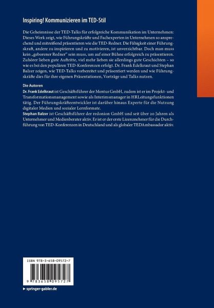 Die Fähigkeit einer Führungskraft, andere zu inspirieren und zu motivieren, ist unverzichtbar. Doch man muss kein "geborener Redner" sein muss, um auf einer Bühne erfolgreich zu präsentieren. Zuhörer lieben gute Auftritte, viel mehr lieben sie allerdings gute Geschichten - so wie es bei den populären TED-Konferenzen erfolgt. Dr. Frank Edelkraut und Stephan Balzer zeigen, wie TED-Talks vorbereitet und präsentiert werden und wie Führungskräfte ihre eigenen Präsentationen, Vorträge, und Talks für die Verbesserung der internen Kommunikation nutzen.