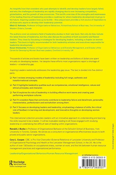 'An insightful text that considers why past attempts to identify and develop leaders have largely failed, and why the challenges of leadership are rapidly changing due to ever increasing competition, globalization, and the growth of new economies. This terrific overview of the strengths and weaknesses of the leading theories of leadership provides a roadmap for where leadership development must go in the future. Inspiring Leaders lives up to its title - this unique book provides a rich source of inspiration to all those who aspire to develop their leadership potential.' - Mitch G. Rothstein, Professor of Organizational Behaviour, Richard Ivey School of Business, The University of Western Ontario, Canada