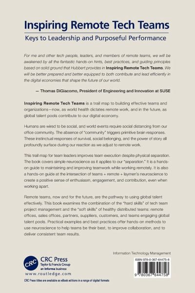 For me and other tech people, leaders, and members of remote teams, we will be awakened by all the fantastic hands-on hints, best practices, and guiding principles based on solid ground that Hubbert provides in Inspiring Remote Tech Teams. We will be better prepared and better equipped to both contribute and lead efficiently in the digital economies that shape the future of our world. - Thomas DiGiacomo, President of Engineering and Innovation at SUSE ¿ Inspiring Remote Tech Teams is a trail map to building effective teams and organizations-now, as world health dictates remote work, and in the future, as global talent pools contribute to our digital economy. Humans are wired to be social, and world events require social distancing from our office community. The absence of "community" triggers primitive brain responses. These instinctual responses of survival, social belonging, and the power of story all profoundly surface during our reaction as we adjust to remote work. This trail map for team leaders improves team execution despite physical separation. The book covers simple neuroscience as it applies to our "separation." It is a hands-on guide to maintaining and improving teamwork while working remotely. It is also a hands-on guide at the intersection of teams + remote + laymen's neuroscience to create a positive sense of enthusiasm, engagement, and contribution, even when working apart. Remote teams, now and for the future, are the pathway to using global talent effectively. This book examines the combination of the "hard skills" of tech team project management and the "soft skills" of healthy distributed teams: remote offices, sales offices, partners, suppliers, customers, and teams engaging global talent pools. Practical examples and best practices offer hands-on methods to use neuroscience to help teams be their best, to improve collaboration, and to deliver consistent team results.
