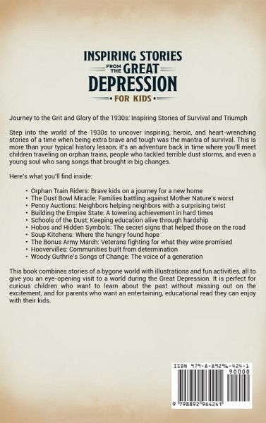 Journey to the Grit and Glory of the 1930s: Inspiring Stories of Survival and Triumph Step into the world of the 1930s to uncover inspiring, heroic, and heart-wrenching stories of a time when being extra brave and tough was the mantra of survival. This is more than your typical history lesson; it's an adventure back in time where you'll meet children traveling on orphan trains, people who tackled terrible dust storms, and even a young soul who sang songs that brought in big changes. Here's what you'll find inside: Orphan Train Riders: Brave kids on a journey for a new home The Dust Bowl Miracle: Families battling against Mother Nature's worst Penny Auctions: Neighbors helping neighbors with a surprising twist Building the Empire State: A towering achievement in hard times Schools of the Dust: Keeping education alive through hardship Hobos and Hidden Symbols: The secret signs that helped those on the road Soup Kitchens: Where the hungry found hope The Bonus Army March: Veterans fighting for what they were promised Hoovervilles: Communities built from determination Woody Guthrie's Songs of Change: The voice of a generation This book combines stories of a bygone world with illustrations and fun activities, all to give you an eye-opening visit to a world during the Great Depression. It is perfect for curious children who want to learn about the past without missing out on the excitement, and for parents who want an entertaining, educational read they can enjoy with their kids.