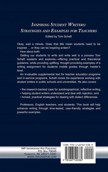 A volume in Literacy, Language, and Learning Series Editor Patricia Ruggiano Schmidt, Le Moyne College Okay, wait a minute. Does that title mean students need to be inspired . . . or they can be inspiring writers? How about both. Getting our students to write and write well is a process Tom Scheft explains and explores- offering practical and theoretical guidance, while providing uplifting, thought provoking examples of a writing assignment for students middle grades through master's level. An invaluable supplemental text for teacher education programs and in-service programs, Scheft mines his experience working with student writers in public schools and universities. He also covers ¿ the research-backed case for autobiographical, reflective writing, ¿ helping student writers understand and deal with rejection, and ¿ honest, practical strategies for dealing with dialect differences. Professors, English teachers, and students: This book will help enhance writing through time-tested, user-friendly strategies and powerful examples.