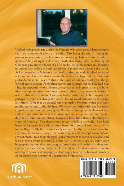 Here at Remington it has become clearly evident that mediocrity wasnot a path chosen by anyone in this book. It has also become vividly apparent that humanitarian contribution was a common theme in the lives of many of these professionals and as a company we made it our primary objective to recognize those contributions first and foremost. Although the foundation of our company is based on networking and mutual collaboration we felt it was our moral obligation to assist in any way we can the professionals who demonstrated extreme self-sacrifice and compassion for others. We would also like to mention that our staff went to great personal length to get the fine details of each and every person in this book. We pride ourselves in offering much more than a registry and a basic summary of each professional. We encourage you the reader to immerse yourself in the lives of others. Experience the joy, pain, adversity, fear and heroism of some of the most brilliant professionals on our planet. Speaking for myself and the staff of the Remington Registry of Outstanding Professionals we hope you enjoy reading our book and it is our sincere desire that you draw inspiration from it and use it as a tool when relentlessly pursuing your dreams.