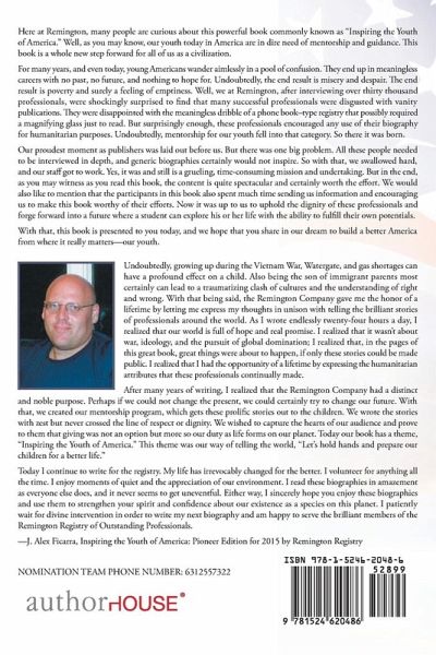 Here at Remington, many people are curious about this powerful book commonly known as "Inspiring the Youth of America." Well, as you may know, our youth today in America are in dire need of mentorship and guidance. This book is a whole new step forward for all of us as a civilization. For many years, and even today, young Americans wander aimlessly in a pool of confusion. They end up in meaningless careers with no past, no future, and nothing to hope for. Undoubtedly, the end result is misery and despair. The end result is poverty and surely a feeling of emptiness. Well, we at Remington, after interviewing over thirty thousand professionals, were shockingly surprised to find that many successful professionals were disgusted with vanity publications. They were disappointed with the meaningless dribble of a phone book-type registry that possibly required a magnifying glass just to read. But surprisingly enough, these professionals encouraged any use of their biography for humanitarian purposes. Undoubtedly, mentorship for our youth fell into that category. So there it was born. Our proudest moment as publishers was laid out before us. But there was one big problem. All these people needed to be interviewed in depth, and generic biographies certainly would not inspire. So with that, we swallowed hard, and our staff got to work. Yes, it was and still is a grueling, time-consuming mission and undertaking. But in the end, as you may witness as you read this book, the content is quite spectacular and certainly worth the effort. We would also like to mention that the participants in this book also spent much time sending us information and encouraging us to make this book worthy of their efforts. Now it was up to us to uphold the dignity of these professionals and forge forward into a future where a student can explore his or her life with the ability to fulfill their own potentials. With that, this book is presented to you today, and we hope that you share in our dream to build a better America from where it really matters-our youth.
