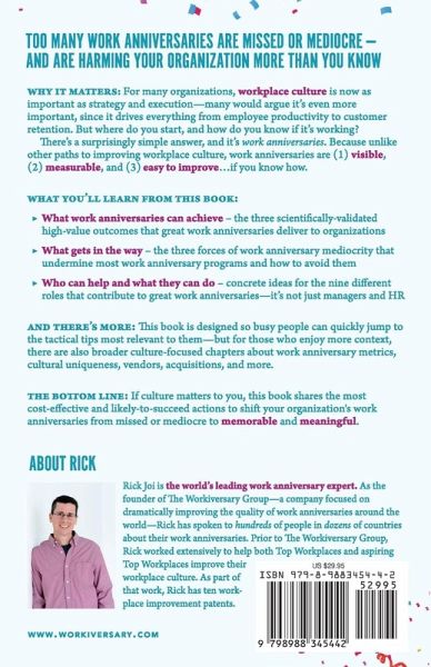 Too many work anniversaries are missed or mediocre - and they're harming your organization more than you know WHY IT MATTERS: For many organizations, workplace culture is now as important as strategy and execution-many would argue it's even more important, since it drives everything from employee productivity to customer retention. But where do you start, and how do you know if it's working? There's a surprisingly simple answer, and it's work anniversaries. Because unlike other paths to improving workplace culture, work anniversaries are (1) visible, (2) measurable, and (3) easy to improve ... if you know how. WHAT YOU'LL LEARN FROM THIS BOOK:What work anniversaries can achieve - the three scientifically-validated high-value outcomes that great work anniversaries deliver to organizations What gets in the way - the three forces of work anniversary mediocrity that undermine most work anniversary programs and how to avoid them Who can help and what they can do - concrete ideas for the nine different roles that contribute to great work anniversaries-it's not just managers and HR THE BOTTOM LINE: If workplace culture matters to you, this book will show you how to take the most cost-effective and likely-to-succeed actions to shift your organization's work anniversaries from missed or mediocre to memorable and meaningful.