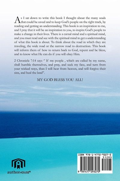 As I sat down to write this book I thought about the many souls that could be saved and to keep God's people on the right track, by reading and getting an understanding. This book is an inspiration to me, and I pray that it will be an inspiration to you, to inspire God's people to make a change in their lives. There is a carnal mind and a spiritual mind, and you must read and see with the spiritual mind to get a understanding of what this book is about. To think about the road in which they are traveling, the wide road or the narrow road to destruction. This book will inform them of how to return back to God, repent and be bless, and to know what He can do if you will obey Him. 2 Chronicle 7:14 says '' If my people , which are called by my name, shall humble themselves, and pray, and seek my face, and turn from your wicked ways, than I will hear from heaven, and will forgive their sins, and heal the land''. MY GOD BLESS YOU ALL!