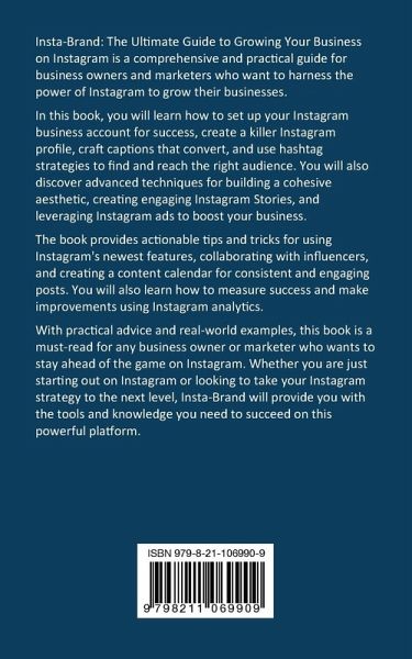 Insta-Brand: The Ultimate Guide to Growing Your Business on Instagram is a comprehensive and practical guide for business owners and marketers who want to harness the power of Instagram to grow their businesses. In this book, you will learn how to set up your Instagram business account for success, create a killer Instagram profile, craft captions that convert, and use hashtag strategies to find and reach the right audience. You will also discover advanced techniques for building a cohesive aesthetic, creating engaging Instagram Stories, and leveraging Instagram ads to boost your business. The book provides actionable tips and tricks for using Instagram's newest features, collaborating with influencers, and creating a content calendar for consistent and engaging posts. You will also learn how to measure success and make improvements using Instagram analytics. With practical advice and real-world examples, this book is a must-read for any business owner or marketer who wants to stay ahead of the game on Instagram. Whether you are just starting out on Instagram or looking to take your Instagram strategy to the next level, Insta-Brand will provide you with the tools and knowledge you need to succeed on this powerful platform. In addition, this book also covers topics specifically for B2B businesses, community building, and advanced strategies to take your business to the next level. Insta-Brand is the ultimate guide for anyone who wants to grow their business on Instagram and stand out from the competition.