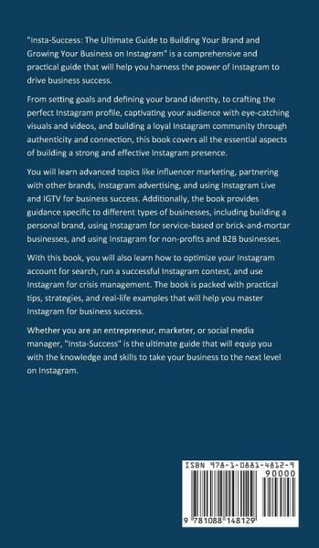 "Insta-Success: The Ultimate Guide to Building Your Brand and Growing Your Business on Instagram" is a comprehensive and practical guide that will help you harness the power of Instagram to drive business success. From setting goals and defining your brand identity, to crafting the perfect Instagram profile, captivating your audience with eye-catching visuals and videos, and building a loyal Instagram community through authenticity and connection, this book covers all the essential aspects of building a strong and effective Instagram presence. You will learn advanced topics like influencer marketing, partnering with other brands, Instagram advertising, and using Instagram Live and IGTV for business success. Additionally, the book provides guidance specific to different types of businesses, including building a personal brand, using Instagram for service-based or brick-and-mortar businesses, and using Instagram for non-profits and B2B businesses. With this book, you will also learn how to optimize your Instagram account for search, run a successful Instagram contest, and use Instagram for crisis management. The book is packed with practical tips, strategies, and real-life examples that will help you master Instagram for business success. Whether you are an entrepreneur, marketer, or social media manager, "Insta-Success" is the ultimate guide that will equip you with the knowledge and skills to take your business to the next level on Instagram.