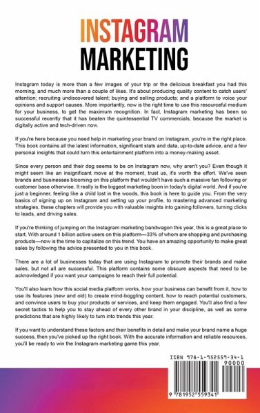 If you want to discover why some people fail with Instagram marketing while others see massive success, and you'd like to join the latter group, then keep reading... Are you sick and tired of marketing efforts that bring about zero results? Have you tried endless other ways to grow your personal brand or small business, but nothing seems to work long-term? Do you finally want to say goodbye to wasted money and discover something that works for you? If so, then you've come to the right place. You see, Instagram marketing doesn't have to be difficult. Even if you've spent hours going through videos and websites and still feel lost, the reality is, it's easier than you think. Here's just a tiny fraction of what you'll discover:The Instagram changes you need to know to stay one step ahead Why you're missing out by not having a proper Instagram presence and the 6 best ways to use stories to build your brand How to use hashtags to your advantage (the right way) Creating consistent content (that converts) How to sell your products on Instagram How Instagram advertising is different from other platforms and what to do to run ads effectively The little-known secrets to leveraging other users with a massive fan following to skyrocket your own success on Instagram The future of influencer marketing so you can always be ahead of the curve And much, much more! Take a second to imagine how you'll feel once you finally achieve the results you're looking for. Even if you're a complete newbie in the Instagram marketing world, you can achieve success with this book. And if you have a burning desire to get started right away to become the next Instagram marketing guru, then scroll up and click "add to cart."