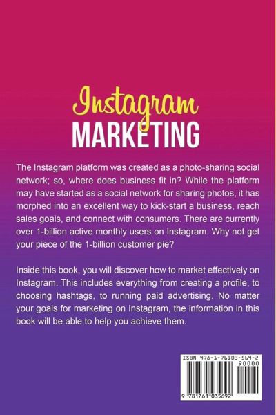 INSTAGRAM MARKETING ¿The Instagram platform was created as a photo-sharing social network; so, where does business fit in? While the platform may have started as a social network for sharing photos, it has morphed into an excellent way to kick-start a business, reach sales goals, and connect with consumers. There are currently over 1-billion active monthly users on Instagram. Why not get your piece of the 1-billion customer pie? Inside this book, you will discover how to market effectively on Instagram. This includes everything from creating a profile, to choosing hashtags, to running paid…mehr