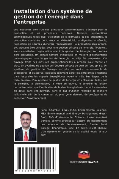 Les industries sont l'un des principaux consommateurs d'énergie pour la production et les processus connexes. Diverses interventions technologiques telles que l'utilisation de la biomasse et des briquettes, la production combinée de chaleur et d'électricité, la digestion anaérobie, l'utilisation de sources d'énergie renouvelables, la production plus propre, etc. peuvent être utilisées pour une gestion efficace de l'énergie. Toutefois, sans contribution organisationnelle à la gestion de l'énergie, son succès sera discutable. Un certain nombre d'initiatives en matière d'interventions technologiques pour la gestion de l'énergie ont déjà été proposées. Cet ouvrage traite des mesures organisationnelles à prendre pour mettre en place un système de gestion de l'énergie efficace au sein de l'entreprise. Un système de gestion de l'énergie est plus ou moins un ensemble de procédures et d'accords indiquant comment gérer les différentes situations dans lesquelles les aspects énergétiques jouent un rôle. Les étapes de la mise en place d'un système de gestion de l'énergie en entreprise, telles que la politique, la planification, la mise en oeuvre, le contrôle et l'action corrective, ainsi que l'implication de la direction générale, ont été examinées en détail dans cet ouvrage, dans le but d'utiliser l'énergie de manière rationnelle afin de la conserver et, plus généralement, de protéger et de préserver l'environnement.