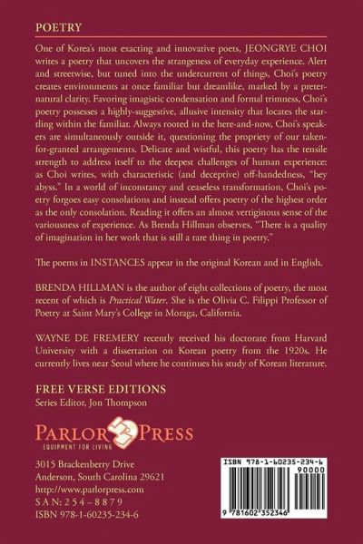 One of Korea's most exacting and innovative poets, JEONGRYE CHOI writes a poetry that uncovers the strangeness of everyday experience. Alert and streetwise, but tuned into the undercurrent of things, Choi's poetry creates environments at once familiar but dreamlike, marked by a preternatural clarity. Favoring imagistic condensation and formal trimness, Choi's poetry possesses a highly-suggestive, allusive intensity that locates the startling within the familiar. Always rooted in the here-and-now, Choi's speakers are simultaneously outside it, questioning the propriety of our taken-for-granted arrangements. Delicate and wistful, this poetry has the tensile strength to address itself to the deepest challenges of human experience: as Choi writes, with characteristic (and deceptive) off-handedness, "hey abyss." In a world of inconstancy and ceaseless transformation, Choi's poetry forgoes easy consolations and instead offers poetry of the highest order as the only consolation. Reading it offers an almost vertiginous sense of the variousness of experience. As Brenda Hillman observes, "There is a quality of imagination in her work that is still a rare thing in poetry." BRENDA HILLMAN is the author of eight collections of poetry, the most recent of which is PRACTICAL WATER. She is the Olivia C. Filippi Professor of Poetry at Saint Mary's College in Moraga, California. WAYNE DE FREMERY recently received his doctorate from Harvard University with a dissertation on Korean poetry from the 1920s. He currently lives near Seoul where he continues his study of Korean literature.