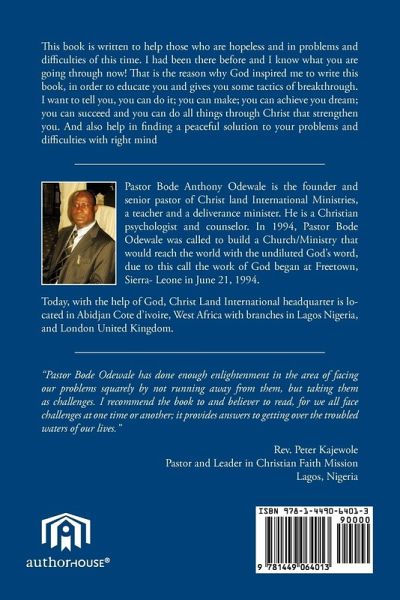 This book is written to help those who are hopeless, who are in poblems and difficulties of this time. I had been there before and I know what you are going through now! That is the reason why God inspired me to write this book, in order to educate you and gives you some tactics of breakthrough. I want to tell you, you can do it, you can make it, you can achieve you dream, you can succeed and you can do all things through Christ that strengthen you. And also help in finding a peaceful solution to your problems and difficulties with right mind