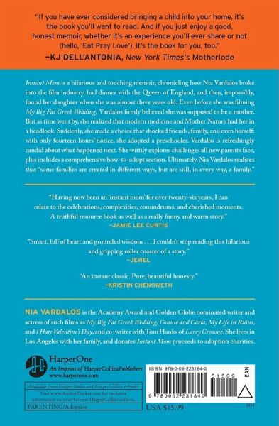 Instant Mom is a hilarious and touching memoir, chronicling how Nia Vardalos broke into the film industry, had dinner with the Queen of England, and then, impossibly, found her daughter when she was almost three years old. Even before she was filming My Big Fat Greek Wedding, Vardalos firmly believed she was supposed to be a mother. But as time went by, she realized that modern medicine and Mother Nature had her in a headlock. Suddenly, she made a choice that shocked friends, family, and even herself: with only fourteen hours' notice, she adopted a preschooler. Vardalos is refreshingly candid about what happened next. She wittily explores challenges all new parents face, plus includes a comprehensive how-to-adopt section. Ultimately, Nia Vardalos realizes that "some families are created in different ways, but are still, in every way, a family."