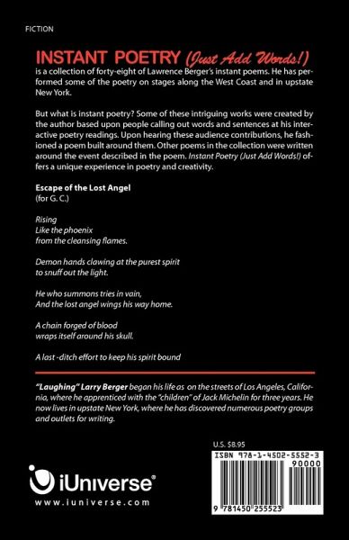 Instant Poetry (Just Add Words!) is a collection of forty-eight of Lawrence Berger's instant poems. He has performed some of the poetry on stages along the West Coast and in upstate New York. But what is instant poetry? Some of these intriguing works were created by the author based upon people calling out words and sentences at his interactive poetry readings. Upon hearing these audience contributions, he fashioned a poem built around them. Other poems in the collection were written around the event described in the poem. Instant Poetry (Just Add Words!) offers a unique experience in poetry and creativity. Escape of the Lost Angel (for G. C.) Rising Like the phoenix from the cleansing flames. Demon hands clawing at the purest spirit to snuff out the light. He who summons tries in vain And the lost angel wings his way home. A chain forged of blood wraps itself around his skull. A last -ditch effort to keep his spirit bound yet, down though the centuries, it is his will that has been strengthened. The horns fall away And the lost angel wings his way home.