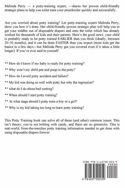 Melinda Perry, a potty-training expert, shares her proven child-friendly strategic plans to help you toilet train your preschooler quickly and successfully. Are you worried about potty training? Let potty-training expert Melinda Perry, show you how it's done. Her child-friendly proven strategic plan will help you to get your toddler out of disposable diapers and onto the toilet which has already worked for thousands of kids and their parents. Here's the good news: your child is probably ready to be potty trained EARLIER than you think (ideally, between 20-30 months), and it can be done FASTER than you expect (most kids get the basics in a few days-but Melinda Perry got you covered even if it takes a little longer). If you've ever said to yourself: · How do I know if my baby is ready for potty training? · Why won't my child pee and poop in the potty? · How do I avoid potty accident and failure? · My kid was doing so well with potty but why the regression? · What do I do about bed wetting? · When should I start potty training? · At what stage should I potty train a boy or a girl? · Why is my kid taking too long to learn potty training? This Potty Training book will solve all of these (and other) common issues. This isn't theory, you're not bribing with candy, and there are no gimmicks. This is real-world, from-the-trenches potty training information needed to get done with using disposable diapers forever.