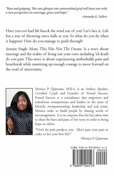 What do you do when 'til death do us part' comes much earlier than anticipated? I have written this book to share my story-a dream that was not to be had. I fell in love, had children, worked on my marriage, and settled in for the long haul; knowing we could get through anything together. Then life through us a curve ball, and the unimaginable happened. Life will have its trials and challenges, trauma and pain. You cannot let it paralyze you. In Instant Single Mom: This Was Not The Dream, I share my personal story of finding love, lessons I have learned along the way, and how I have been able overcome through tough times. Any mother can find herself as an instant single mom-through divorce, deployment of a partner or spouse, separation, or in my case, death. Instant Single Mom will help those thinking about marriage and becoming a parent, newlyweds, military wives, widowers, or divorcees to cope with the uncertainty of life's transitions in order to live on purpose and thrive!