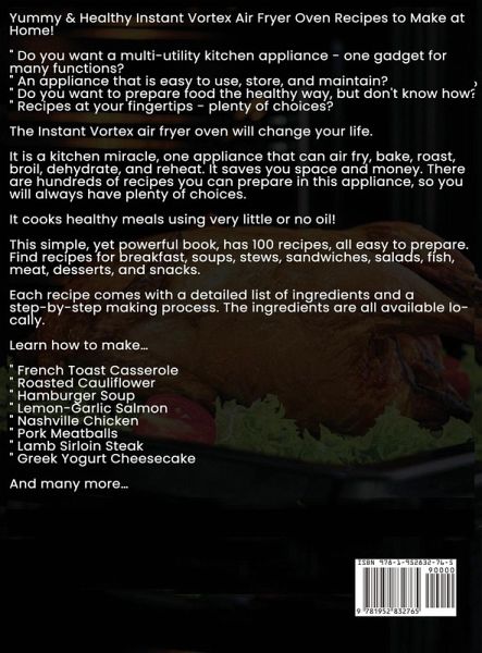 Yummy & Healthy Instant Vortex Air Fryer Oven Recipes to Make at Home! ¿ Do you want a multi-utility kitchen appliance - one gadget for many functions? ¿ An appliance that is easy to use, store, and maintain? ¿ Do you want to prepare food the healthy way, but don't know how? ¿ Recipes at your fingertips - plenty of choices? The Instant Vortex air fryer oven will change your life. It is a kitchen miracle, one appliance that can air fry, bake, roast, broil, dehydrate, and reheat. It saves you space and money. There are hundreds of recipes you can prepare in this appliance, so you will always have plenty of choices. It cooks healthy meals using very little or no oil! This simple, yet powerful book, has 100 recipes, all easy to prepare. Find recipes for breakfast, soups, stews, sandwiches, salads, fish, meat, desserts, and snacks. Each recipe comes with a detailed list of ingredients and a step-by-step making process. The ingredients are all available locally. Learn how to make... ¿ French Toast Casserole ¿ Roasted Cauliflower ¿ Hamburger Soup ¿ Lemon-Garlic Salmon ¿ Nashville Chicken ¿ Pork Meatballs ¿ Lamb Sirloin Steak ¿ Greek Yogurt Cheesecake And many more... This complete air fryer cookbook is for everyone who wants to prepare quick and healthy meals and have limited kitchen space. It is for those who prefer to eat at home, instead of unhealthy restaurant food. It is a must-have for modern kitchens and healthy families!