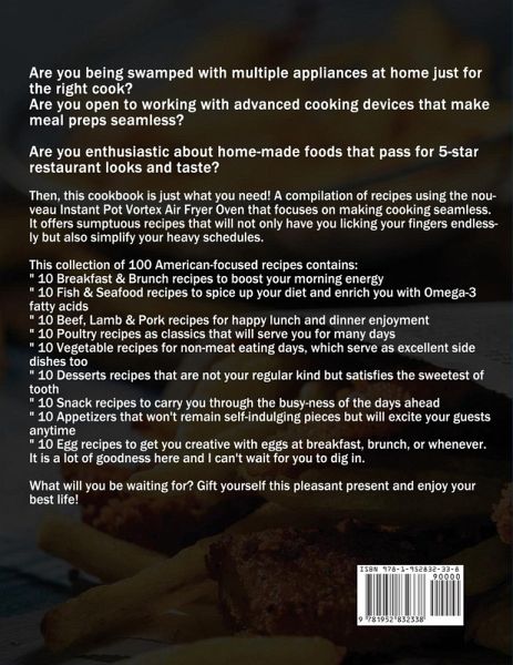 Are you being swamped with multiple appliances at home just for the right cook? Are you open to working with advanced cooking devices that make meal preps seamless? Are you enthusiastic about home-made foods that pass for 5-star restaurant looks and taste? Then, this cookbook is just what you need! A compilation of recipes using the nouveau Instant Pot Vortex Air Fryer Oven that focuses on making cooking seamless. It offers sumptuous recipes that will not only have you licking your fingers endlessly but also simplify your heavy schedules. This collection of 100 American-focused recipes contains:10 Breakfast & Brunch recipes to boost your morning energy 10 Fish & Seafood recipes to spice up your diet and enrich you with Omega-3 fatty acids 10 Beef, Lamb & Pork recipes for happy lunch and dinner enjoyment 10 Poultry recipes as classics that will serve you for many days 10 Vegetable recipes for non-meat eating days, which serve as excellent side dishes too 10 Desserts recipes that are not your regular kind but satisfies the sweetest of tooth 10 Snack recipes to carry you through the busy-ness of the days ahead 10 Appetizers that won't remain self-indulging pieces but will excite your guests anytime 10 Egg recipes to get you creative with eggs at breakfast, brunch, or whenever. It is a lot of goodness here and I can't wait for you to dig in. What will you be waiting for? Gift yourself this pleasant present and enjoy your best life!