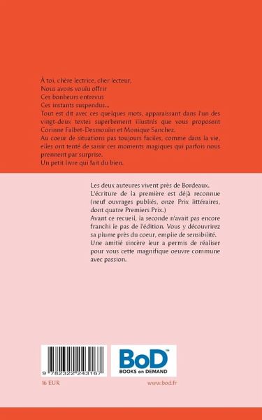 À toi, chère lectrice, cher lecteur,Nous avons voulu offrirCes bonheurs entrevusCes instants suspendus...Tout est dit avec ces quelques mots, apparaissant dans l'un des vingt-deux textes superbement illustrés que vous proposent Corinne Falbet-Desmoulin et Monique Sanchez.Au coeur de situations pas toujours faciles, comme dans la vie, elles ont tenté de saisir ces moments magiques qui parfois nous prennent par surprise.Un petit livre qui fait du bien.