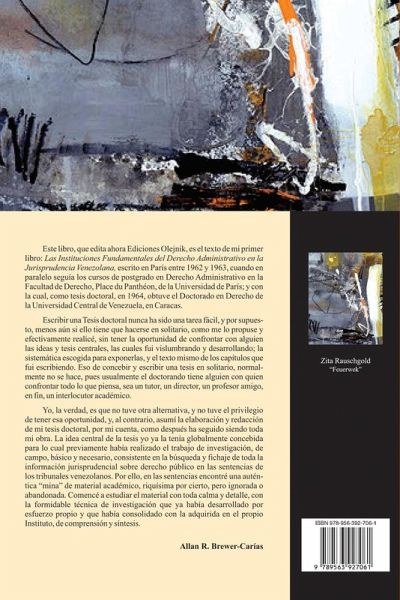 Esta obra editada por Ediciones Olejnik, es la primera reimpresión de la que fue la tesis doctoral del profesor Allan R. Brewer-Carías, presentada en la Universidad Central de Venezuela en 1964 para obtener el Doctorado en Derecho, y que llevó por título de "Las Institutiones Fundamentales del Derecho Administrativo y la Jurisprudencia Venezolanas." En ella, el autor expuso por primera vez en su país, en forma sistemática, las bases del derecho administrativo partiendo de lo que había sido resuelto en multitud de casos por las Altas Cortes de entonces con competencia en materia constitucional y administrativa (Corte Federal, y Sala Político Administrativa de la Corte Federal y de Casacion y de la Corte Suprema de Justicia), particularmente entre 1950 y 1962. En esa forma, partiendo de la jurisprudencia, Brewer-Carías expuso en este libro las instituciones fundamentales del derecho administrativo; libro que desde entonces ha sevido como uno de los manuales clásicos en la materia. El método comparativo utilizado y el recurso permanente al estudio de la jurisprudencia, entonces novedosos en su país, se expican por el hecho de que Brewer-Carías redactó su trabajo íntegramente en París, entre 1962 y 1963, mientras seguía los cursos de Tercer Ciclo sobre derecho administrativo en la Facultad de Derecho de la Universidad de Paris (Place du Panthéon), donde tuvo acceso a toda la bibliografía existente. Con tal propósito, además, allí se había llevado desde Caracas todos los ficheros de jurisprudencia que había elaborado personalmente durante los dos años precedentes (1960-1962) como resultado de la lectura del texto íntegro de cada sentencia, tarea que había cuplido cuando aún era estudiante, como auxiliar de Investigación en el Instituto de Derecho Público de la Universidad Central de Venezuela (donde inició su carrera académica en 1960), y en el Instituto de Codificación y Jurisprudencia del Ministerio de Justicia.