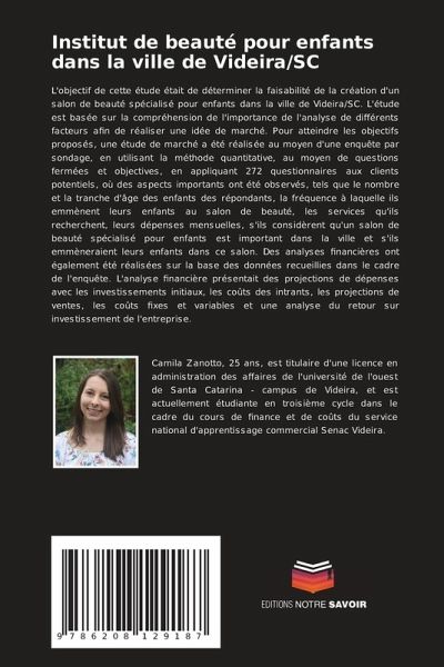 L'objectif de cette étude était de déterminer la faisabilité de la création d'un salon de beauté spécialisé pour enfants dans la ville de Videira/SC. L'étude est basée sur la compréhension de l'importance de l'analyse de différents facteurs afin de réaliser une idée de marché. Pour atteindre les objectifs proposés, une étude de marché a été réalisée au moyen d'une enquête par sondage, en utilisant la méthode quantitative, au moyen de questions fermées et objectives, en appliquant 272 questionnaires aux clients potentiels, où des aspects importants ont été observés, tels que le nombre et la tranche d'âge des enfants des répondants, la fréquence à laquelle ils emmènent leurs enfants au salon de beauté, les services qu'ils recherchent, leurs dépenses mensuelles, s'ils considèrent qu'un salon de beauté spécialisé pour enfants est important dans la ville et s'ils emmèneraient leurs enfants dans ce salon. Des analyses financières ont également été réalisées sur la base des données recueillies dans le cadre de l'enquête. L'analyse financière présentait des projections de dépenses avec les investissements initiaux, les coûts des intrants, les projections de ventes, les coûts fixes et variables et une analyse du retour sur investissement de l'entreprise.