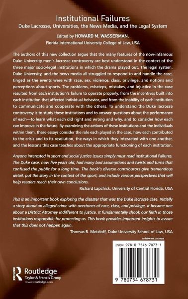 The authors of this new collection argue that the many features of the now-infamous Duke University men's lacrosse controversy are best understood in the context of the three major socio-legal institutions in which the drama played out. The legal system, Duke University, and the news media all struggled to respond to and handle the case, tinged as the events were with race, sex, violence, class, privilege, and notions and perceptions about sports. The problems, missteps, mistakes, and injustice in the case resulted from each institution's failure to operate properly, from the incentives built into each institution that affected individual behavior, and from the inability of each institution to communicate and cooperate with the others. To understand the Duke lacrosse controversy is to study these institutions and to answer questions about the performance of each-to learn what each did right and wrong and why, and to consider how each can improve in the future. By examining the actions of these institutions and the individuals within them, these essays consider the role each played in the case, how each contributed to the crisis and to its resolution, the ways in which they interacted with one another, and the lessons this case teaches about the appropriate functioning of each institution.