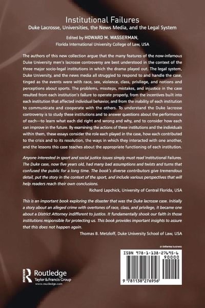 The authors of this new collection argue that the many features of the now-infamous Duke University men's lacrosse controversy are best understood in the context of the three major socio-legal institutions in which the drama played out. The legal system, Duke University, and the news media all struggled to respond to and handle the case, tinged as the events were with race, sex, violence, class, privilege, and notions and perceptions about sports. The problems, missteps, mistakes, and injustice in the case resulted from each institution's failure to operate properly, from the incentives built into each institution that affected individual behavior, and from the inability of each institution to communicate and cooperate with the others. To understand the Duke lacrosse controversy is to study these institutions and to answer questions about the performance of each-to learn what each did right and wrong and why, and to consider how each can improve in the future. By examining the actions of these institutions and the individuals within them, these essays consider the role each played in the case, how each contributed to the crisis and to its resolution, the ways in which they interacted with one another, and the lessons this case teaches about the appropriate functioning of each institution.