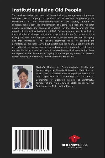 This work carried out a conceptual theoretical study on ageing and the major changes that accompany this process in our society, emphasising the implications for the institutionalisation of the elderly. Based on considerations about the phenomenon of ageing in Brazil, the research sought to analyse the context of shelters for the elderly and the care provided by Long Stay Institutions (ILPIs). Our general aim was to reflect on the socio-historical aspects that make up an institution for the care of the elderly and the repercussions of the institutionalisation process on ageing and frail individuals. The specific objectives were: to describe the gerontological practices carried out in ILPIs and the nuances achieved by the perception of the ageing process; to problematise institutionalised old age in an interdisciplinary way; to present the psychoanalytical aspects that have an impact on the discomfort of ageing in contemporary times; to research issues relating to enclosure, reminiscence and resistance.