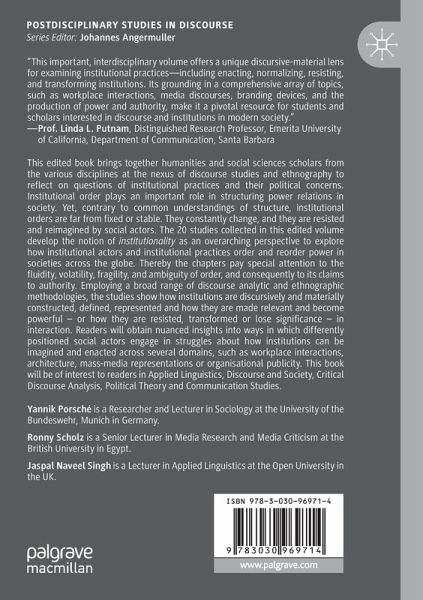 This edited book brings together humanities and social sciences scholars from the various disciplines at the nexus of discourse studies and ethnography to reflect on questions of institutional practices and their political concerns. Institutional order plays an important role in structuring power relations in society. Yet, contrary to common understandings of structure, institutional orders are far from fixed or stable. They constantly change, and they are resisted and reimagined by social actors. The 20 studies collected in this edited volume develop the notion of institutionality as an overarching perspective to explore how institutional actors and institutional practices order and reorder power in societies across the globe. Thereby the chapters pay special attention to the fluidity, volatility, fragility, and ambiguity of order, and consequently to its claims to authority. Employing a broad range of discourse analytic and ethnographic methodologies, the studies show how institutions are discursively and materially constructed, defined, represented and how they are made relevant and become powerful - or how they are resisted, transformed or lose significance - in interaction. Readers will obtain nuanced insights into ways in which differently positioned social actors engage in struggles about how institutions can be imagined and enacted across several domains, such as workplace interactions, architecture, mass-media representations or organisational publicity. This book will be of interest to readers in Applied Linguistics, Discourse and Society, Critical Discourse Analysis, Political Theory and Communication Studies.