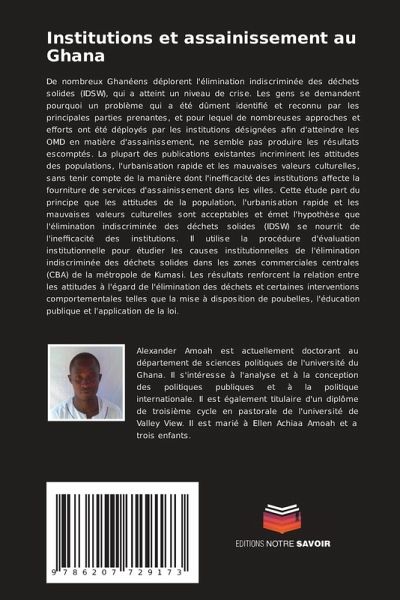 De nombreux Ghanéens déplorent l'élimination indiscriminée des déchets solides (IDSW), qui a atteint un niveau de crise. Les gens se demandent pourquoi un problème qui a été dûment identifié et reconnu par les principales parties prenantes, et pour lequel de nombreuses approches et efforts ont été déployés par les institutions désignées afin d'atteindre les OMD en matière d'assainissement, ne semble pas produire les résultats escomptés. La plupart des publications existantes incriminent les attitudes des populations, l'urbanisation rapide et les mauvaises valeurs culturelles, sans tenir compte de la manière dont l'inefficacité des institutions affecte la fourniture de services d'assainissement dans les villes. Cette étude part du principe que les attitudes de la population, l'urbanisation rapide et les mauvaises valeurs culturelles sont acceptables et émet l'hypothèse que l'élimination indiscriminée des déchets solides (IDSW) se nourrit de l'inefficacité des institutions. Il utilise la procédure d'évaluation institutionnelle pour étudier les causes institutionnelles de l'élimination indiscriminée des déchets solides dans les zones commerciales centrales (CBA) de la métropole de Kumasi. Les résultats renforcent la relation entre les attitudes à l'égard de l'élimination des déchets et certaines interventions comportementales telles que la mise à disposition de poubelles, l'éducation publique et l'application de la loi.