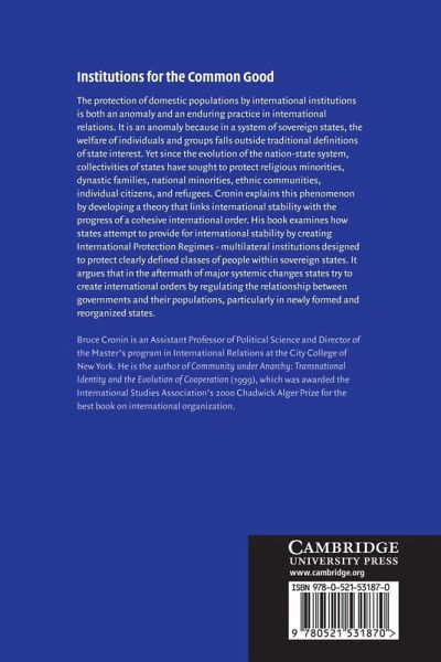 Bruce Cronin develops a theory that links international stability with progress in building a cohesive international order. He examines how states attempt to provide for international stability by creating International Protection Regimes--multilateral institutions designed to protect clearly defined classes of people within sovereign states. Cronin argues that, in the aftermath of major systemic changes, states try to create international orders by regulating the relationship between governments and their populations, particularly in newly formed and reorganized states.