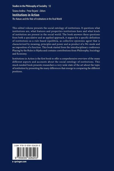 This edited volume presents the social ontology of institutions. It questions what institutions are, what features and properties institutions have and what kinds of institution are present in the social world. The book answers these questions from both a speculative and an applied approach, it argues for a specific definition of institutions as a rule-based equilibria, as collective epistemic agent that is characterized by meaning, principles and power and as product of a We-mode and an imposition of a function. This book started from the interdisciplinary conference Playing by the Rules in Rijeka and contains contributions from Philosophy, Sociology and Economy.