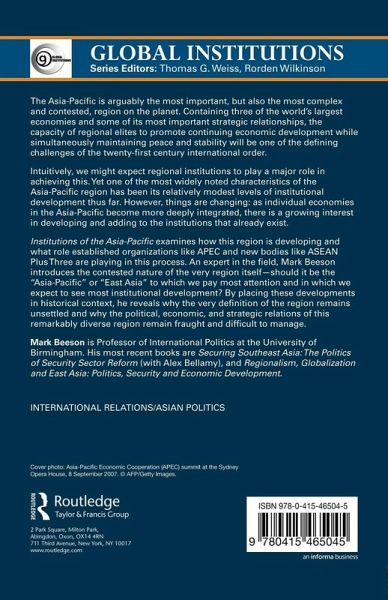 The Asia-Pacific is arguably the most important, but also the most complex and contested, region on the planet. Containing three of the world's largest economies and some of its most important strategic relationships, the region's capacity of regional elites to promote continuing economic development whilst simultaneously maintaining peace and stability will be one of the defining challenges of the twenty-first century international order. Intuitively, we might expect regional institutions to play a major role in achieving this. Yet one of the most widely noted characteristics of the Asia-Pacific region has been its relatively modest levels of institutional development thus far. However, things are changing: as individual economies in the Asia-Pacific become more deeply integrated, there is a growing interest in developing and adding to the institutions that already exist. Institutions of the Asia-Pacific examines how this region is developing, and what role established organisations like APEC and new bodies like ASEAN Plus Three are playing in this process. An expert in the field, Mark Beeson introduces the contested nature of the very region itself - should it be the 'Asia-Pacific' or 'East Asia' to which we pay most attention and expect to see most institutional development. By placing these developments in historical context, he reveals why the very definition of the region remains unsettled and why the political, economic and strategic relations of this remarkably diverse region remain fraught and difficult to manage.