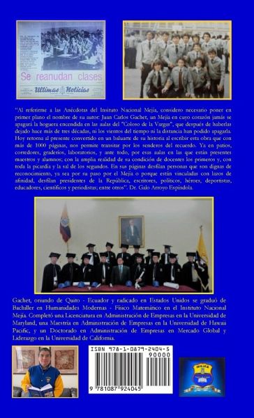 La iniciativa de contar nuestras experiencias durante el paso por las aulas del Colegio Mejía nace durante la ceremonia simbólica de incorporación de agosto del 2015 después de 32 años de haber egresado de esta noble institución del saber y la democracia. Ese año fue 1983.Se recopilaron datos históricos y los ingredientes fundamentales de alumnos y maestros durante 6 años para que este proyecto pase a la posteridad en un libro de las memorias de nuestras vivencias en el Mejía.La portada fue diseñada por el autor, las fotos de mi archivo personal, otras proporcionadas por los compañeros, así como de diferentes fuentes citadas en el texto.Las anécdotas nos han transportado a través del tiempo por diferentes épocas desde la Edad Antigua hasta la Edad Contemporánea, se mencionan obras maestras de la Literatura Universal como La Divina Comedia y El ingenioso hidalgo don Quijote de la Mancha. Hechos históricos trascendentales como la Revolución francesa que encendió la mecha para los movimientos independentistas de América, la revolución liberal de 1895, la guerra civil española, guerra del 41, guerra del Cenepa, y por ende los personajes históricos como Sófocles, Napoleón Bonaparte, José Mejía Lequerica, Eloy Alfaro, Isidro Ayora, José María Velasco Ibarra, Galo Plaza Lasso, Lenín Moreno y otros entes importantes mencionados por los compañeros y como parte de la investigación y recopilación de datos para la publicación de este libro El objetivo primordial de esta publicación es promocionar la amistad y compartir las experiencias de sus personajes a lo largo de sus trayectorias durante la vida estudiantil y posterior al colegio que los formó para ser unos profesionales y proyectar esas vivencias a las futuras generaciones. Espero que el encuentro en el colegio no sea el último y mantengamos ese contacto siempre.Ahora quiero expresar mi más sincero agradecimiento a todos los compañeros, profesores de aquella época y familiares quienes colaboraron con sus relatos para que esta publicación se haga realidad.Espero que sea de su agrado y al leer las anécdotas se remonten a esos tiempos que jamás se olvidan y más que nada la gran amistad que hemos forjado a través del tiempo y nos encontremos nuevamente con nuestras familias en un futuro cercano.Estuvimos en la mejor versión del Patrón Mejía, pero éramos campeones en todo, o casi todo. La selección de básquet campeona todos los años que fui estudiante, fútbol, atletismo, el grupo folklórico, la banda de guerra, en fin, tantas cosas más. Juan Carlos Gachet.