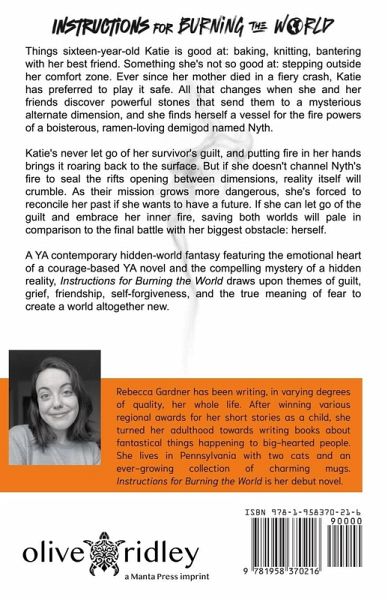 Things sixteen-year-old Katie is good at: baking, knitting, bantering with her best friend. Something she's not so good at: stepping outside her comfort zone. Ever since her mother died in a fiery car crash, Katie has preferred to play it safe. That changes when she and her friends discover powerful stones that send them to a mysterious alternate dimension, and she finds herself a vessel for the fire powers of a boisterous, ramen-loving demigod named Nyth. Katie's never let go of her survivor's guilt, and putting fire in her hands brings it roaring back to the surface. But if she doesn't channel Nyth's fire to seal the rifts opening between dimensions, reality itself will crumble. As their mission grows more dangerous, she's forced to reconcile her past if she wants to have a future. If she can let go of the guilt and embrace her inner fire, saving both worlds will pale in comparison to the final battle with her biggest obstacle: herself. A YA contemporary hidden-world fantasy featuring the emotional heart of a courage-based YA novel and the compelling mystery of a hidden reality, Instructions for Burning the World draws upon themes of guilt, grief, friendship, self-forgiveness, and the true meaning of fear to create a world altogether new.