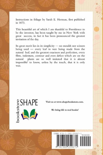 Instructions in foliage by Sarah E. Herman, first published in 1873. This beautiful art of which I am thankful to Providence to be the inventor, has been taught by me in New York with great success, in fact it has been pronounced the greatest invitation of the day. Its great merit lies in its simplicity - no moulds nor scissors being used - every leaf in wax being made from the natural leaf; and the greatest exactness and perfection, every fibre, indenture, contour and even defect which are on the natural plants are so well imitated that it is almost impossible' to know, unless by the touch, that it is only wax.