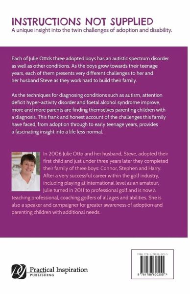 Julie Otto lives in Fife, Scotland with her husband Steve, their three children, four dogs, three cats and two tortoises. An accomplished golfer, who has represented her country in international events, she's found life very different since adopting her boys. In Instructions Not Supplied, Julie gives a frank and honest account of what it means to be the parent of adopted children and how she and Steve realised that their children were different. Struggling to come to terms with a diagnosis of autistic spectrum disorder for all three boys, Julie developed her knowledge and understanding of this and other related conditions, learning what it means to parent three very different children, each with their unique needs, and building a family unlike any other. She is now a speaker and campaigner for greater awareness of adoption and parenting children with special educational needs / additional support needs.