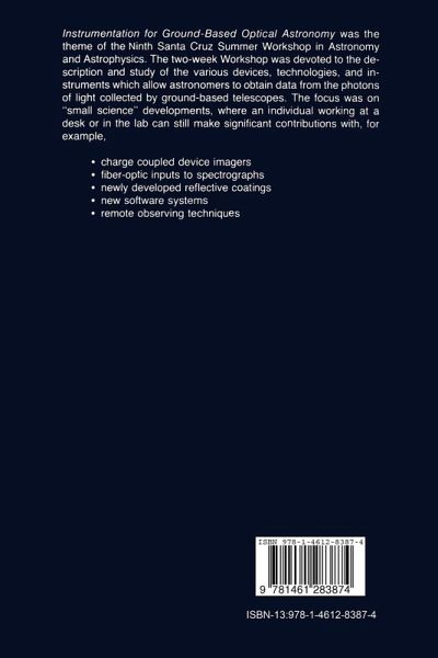 Historically, the discovery of tools, or evidence that tools have been used, has been taken as proof of human activity; certainly the invention and spread of new tools has been a critical marker of human progress and has increased our ability to observe, measure, and understand the physical world. In astronomy the tools are telescopes and the optical and electronic instruments that support them. The use of the telescope by Galileo marked the beginning of a new and productive way to study and understand the universe in which we live. The effects of this new tool on what we can see, and how we see ourselves, are well known. However, after almost four centuries of developing ever more sensitive and subtle instruments as tools for astronomy, it might have been expected that only a few minor improvements would remain to be made, or that possibly the law of diminishing returns would have taken effect. On the contrary, the new instruments and ideas for new instruments described in this book make it clear that the rate of progress has not diminished, and that this subject is still as exciting and productive as ever. Instrumentation for Ground-Based Optical Astronomy was chosen as the theme for the Ninth Santa Cruz Summer Workshop in Astronomy and Astrophysics.