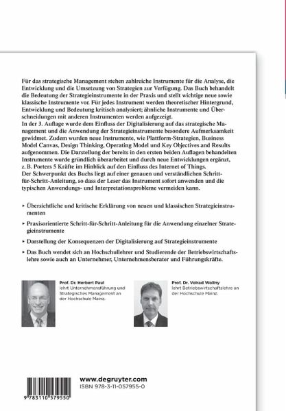In der 3. Auflage wurde dem Einfluss der Digitalisierung auf das strategische Management und die Anwendung der Strategieinstrumente besondere Aufmerksamkeit gewidmet. Zudem wurden neue Instrumente, wie Plattform-Strategien, Business Model Canvas, Design Thinking, Operating Model und Key Objectives and Results aufgenommen. Die Darstellung der bereits in den ersten beiden Auflagen behandelten Instrumente wurde gründlich überarbeitet und durch neue Entwicklungen ergänzt, z. B. Porter's 5 Kräfte im Hinblick auf den Einfluss des Internet of Things.
