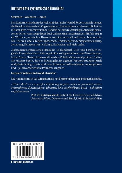 Das Zusammenwachsen der Welt und der rasche Wandel fordern uns alle heraus, als Einzelne, aber auch als Organisationen, Unternehmen und menschliche Gemeinschaften. Was systemisches Handeln bei diesen schwierigen Anpassungsprozessen leisten kann, zeigt dieses Buch anhand einer inspirierenden Einführung in die Welt des systemischen Denkens und einer Auswahl praktischer Instrumente. Die Themen sind: Großgruppenarbeit, Umfeldanalyse, Strategieentwicklung,Steuerung, Kompetenzentwicklung, Evaluation und viele mehr. "Instrumente systemischen Handelns" ist Handbuch, Lese- und Lernbuch zugleich. Es wendet sich an Führungskräfte in Organisationen und Verwaltungen, Lehrer/innen, Trainer/innen und Coaches, Politiker/innen und politisch Aktive, die erkannt haben, dass es darum geht, im eigenen Verantwortungsbereich schöpferisch tätig zu sein und neue Antworten auf bestehende, vorausgeahnte und - ja, unvorhersehbare Probleme zu geben.
