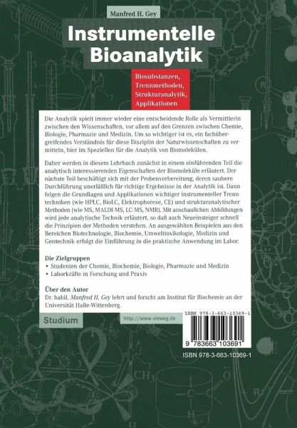 Die Analytik spielt immer wieder eine entscheidende Rolle als Vermittlerin zwischen den Wissenschaften, vor allem auf den Grenzen zwischen Chemie, Biologie und Pharmazie. Um so wichtiger ist es, ein fachübergreifendes Verständnis für diese Disziplin zu vermitteln, hier im Speziellen für die Analytik von Biomolekülen. Daher werden zunächst in einem einführenden Teil die analytisch interessierenden Eigenschaften der Biomoleküle erläutert. Der nächste Teil des Lehrbuches beschäftigt sich mit der Probenvorbereitung, deren saubere Durchführung unerläßlich ist für gute Ergebnisse in der Analytik. Dann folgen die Grundlagen und Applikationen aller instrumentellen Trenntechniken und strukturanalytischen Methoden. Mit anschaulichen Abbildungen wird jede Methode erläutert, so daß auch Neueinsteiger schnell die Prinzipien der Methoden verstehen. An ausgewählten Beispielen erfolgt die Einführung in die praktische Anwendung im Labor.