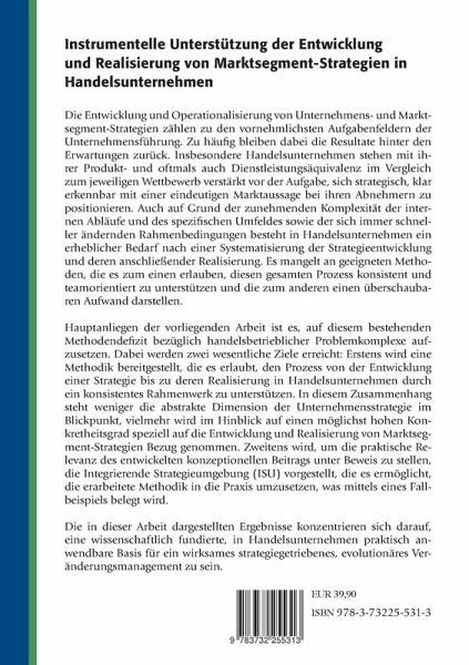 Die Entwicklung und Operationalisierung von Unternehmens- und Marktsegment-Strategien zählen zu den vornehmlichsten Aufgabenfeldern der Unternehmensführung. Zu häufig bleiben dabei die Resultate hinter den Erwartungen zurück. Insbesondere Handelsunternehmen stehen mit ihrer Produkt- und oftmals auch Dienstleistungsäquivalenz im Vergleich zum jeweiligen Wettbewerb verstärkt vor der Aufgabe, sich strategisch, klar erkennbar mit einer eindeutigen Marktaussage bei ihren Abnehmern zu positionieren. Auch auf Grund der zunehmenden Komplexität der internen Abläufe und des spezifischen Umfeldes sowie der sich immer schneller ändernden Rahmenbedingungen besteht in Handelsunternehmen ein erheblicher Bedarf nach einer Systematisierung der Strategieentwicklung und deren anschließender Realisierung. Es mangelt an geeigneten Methoden, die es zum einen erlauben, diesen gesamten Prozess konsistent und teamorientiert zu unterstützen und die zum anderen einen überschaubaren Aufwand darstellen.Hauptanliegen der vorliegenden Arbeit ist es, auf diesem bestehenden Methodendefizit bezüglich handelsbetrieblicher Problemkomplexe aufzusetzen. Dabei werden zwei wesentliche Ziele erreicht: Erstens wird eine Methodik bereitgestellt, die es erlaubt, den Prozess von der Entwicklung einer Strategie bis zu deren Realisierung in Handelsunternehmen durch ein konsistentes Rahmenwerk zu unterstützen. In diesem Zusammenhang steht weniger die abstrakte Dimension der Unternehmensstrategie im Blickpunkt, vielmehr wird im Hinblick auf einen möglichst hohen Konkretheitsgrad speziell auf die Entwicklung und Realisierung von Marktsegment-Strategien Bezug genommen. Zweitens wird, um die praktische Relevanz des entwickelten konzeptionellen Beitrags unter Beweis zu stellen, die Integrierende Strategieumgebung (ISU) vorgestellt, die es ermöglicht, die erarbeitete Methodik in die Praxis umzusetzen, was mittels eines Fallbeispiels belegt wird. Die in dieser Arbeit dargestellten Ergebnisse konzentrieren sich darauf, eine wissenschaftlich fundierte, in Handelsunternehmen praktisch anwendbare Basis für ein wirksames strategiegetriebenes, evolutionäres Veränderungsmanagement zu sein.