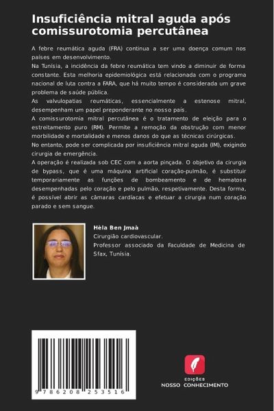 A febre reumática aguda (FRA) continua a ser uma doença comum nos países em desenvolvimento.Na Tunísia, a incidência da febre reumática tem vindo a diminuir de forma constante. Esta melhoria epidemiológica está relacionada com o programa nacional de luta contra a FARA, que há muito tempo é considerada um grave problema de saúde pública.As valvulopatias reumáticas, essencialmente a estenose mitral, desempenham um papel preponderante no nosso país.A comissurotomia mitral percutânea é o tratamento de eleição para o estreitamento puro (RM). Permite a remoção da obstrução com menor morbilidade e mortalidade e menos danos do que as técnicas cirúrgicas.No entanto, pode ser complicada por insuficiência mitral aguda (IM), exigindo cirurgia de emergência.A operação é realizada sob CEC com a aorta pinçada. O objetivo da cirurgia de bypass, que é uma máquina artificial coração-pulmão, é substituir temporariamente as funções de bombeamento e de hematose desempenhadas pelo coração e pelo pulmão, respetivamente. Desta forma, é possível abrir as câmaras cardíacas e efetuar a cirurgia num coração parado e sem sangue.