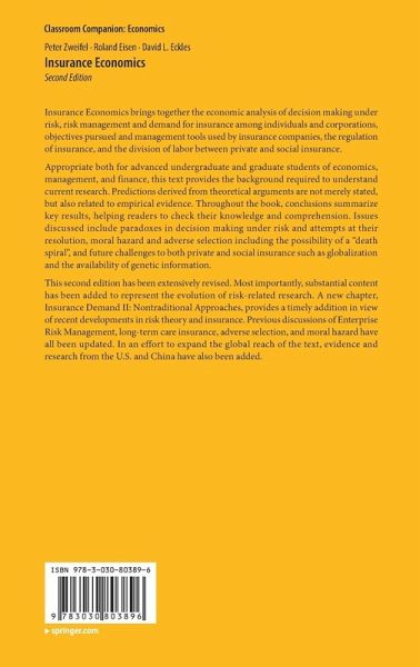 Appropriate both for advanced undergraduate and graduate students of economics, management, and finance, this text provides the background required to understand current research. Predictions derived from theoretical arguments are not merely stated, but also related to empirical evidence. Throughout the book, conclusions summarize key results, helping readers to check their knowledge and comprehension. Issues discussed include paradoxes in decision making under risk and attempts at their resolution, moral hazard and adverse selection including the possibility of a "death spiral", and future challenges to both private and social insurance such as globalization and the availability of genetic information.