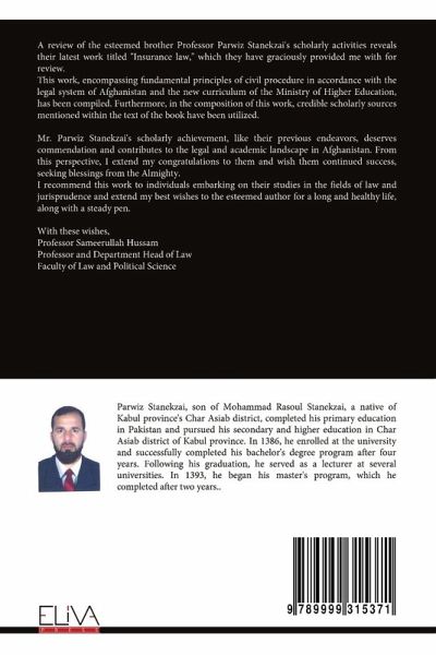 A review of the esteemed brother Professor Parwiz Stanekzai's scholarly activities reveals their latest work titled ""Insurance law,"" which they have graciously provided me with for review. This work, encompassing fundamental principles of civil procedure in accordance with the legal system of Afghanistan and the new curriculum of the Ministry of Higher Education, has been compiled. Furthermore, in the composition of this work, credible scholarly sources mentioned within the text of the book have been utilized. Mr. Parwiz Stanekzai's scholarly achievement, like their previous endeavors, deserves commendation and contributes to the legal and academic landscape in Afghanistan. From this perspective, I extend my congratulations to them and wish them continued success, seeking blessings from the Almighty. I recommend this work to individuals embarking on their studies in the fields of law and jurisprudence and extend my best wishes to the esteemed author for a long and healthy life, along with a steady pen. With these wishes, Professor Sameerullah Hussam Professor and Department Head of Law Faculty of Law and Political Science