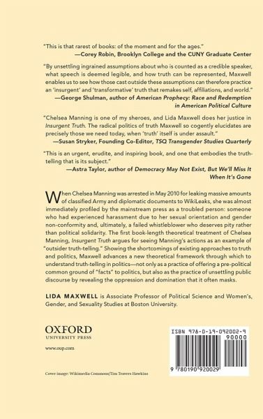 When Chelsea Manning was arrested in May 2010 for leaking massive amounts of classified Army and diplomatic documents to WikiLeaks, she was almost immediately profiled by the mainstream press as a troubled person: someone who had experienced harassment due to her sexual orientation and gender non-conformity, and who leaked documents not on behalf of the public good, but out of motives of personal revenge or, as suggested in the New York Times, "delusions of grandeur." Compared implicitly to Daniel Ellsberg's apparently selfless devotion to the truth and the public good, Manning comes up short in these profiles--a failed whistleblower who deserves pity rather than political solidarity. The first book-length theoretical treatment of Manning's actions, Insurgent Truth argues for seeing Manning's example differently: as an act of what the book terms "outsider truth-telling." Bringing Manning's truth-telling into conversation with democratic, feminist, and queer theory, the book argues that outsider truth-tellers such as Manning tell or enact unsettling truths from a position of social illegibility. Challenging the social alignment of credibility with gendered, classed, and raced traits, outsider truth-tellers reveal oppression and violence that the dominant class would otherwise not see, and disclose the possibility of a more egalitarian form of life. Read as outsider truth-telling, the book argues that Manning's acts were not aimed at curbing corporate or governmental bad acts, but instead at transforming public discourse and agency, and inciting a solidaristic public. The book suggests that Manning's actions offer a productive example of democratic truth-telling for all of us. Lida Maxwell develops this argument through an examination of Manning's prison writings, the lengthy chat logs between Manning and the hacker who eventually turned her in, various journalistic, artistic, and academic responses to Manning, and by comparing Manning's example and writings with the work and actions of other outsider truth-tellers, including Cassandra, Virginia Woolf, Bayard Rustin, and Audre Lorde. Showing the shortcomings of existing approaches to truth and politics, Maxwell advances a new theoretical framework through which to understand truth-telling in politics: not only as a practice of offering a pre-political common ground of "facts" to politics, but also as the practice of unsettling public discourse by revealing the oppression and domination that it often masks.