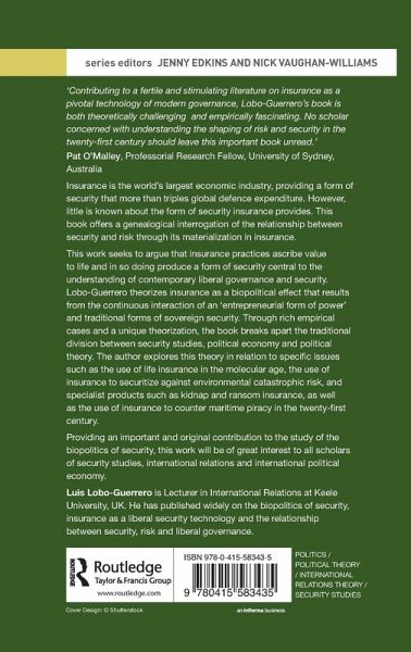 Insurance is the world's largest economic industry, providing a form of security that more than triples global defence expenditure. However, little is know about the form of security insurance provides. This book offers a genealogical interrogation of the relationship between security and risk through its materialisation in insurance. This work seeks to argue that insurance practices ascribe value to life and in so doing produce a form of security central to the understanding of contemporary liberal governance and security. Lobo-Guerrero theorizes insurance as a biopolitical effect that results from the continuous interaction of an 'entrepreneurial form of power', and traditional forms of sovereign security. Through rich empirical cases and a unique theorization, the book breaks apart the traditional division between security studies, political economy and political theory. The author explores this theory in relation to specific issues such as the use of life insurance in the molecular age, the use of insurance to securitize against environmental catastrophic risk, specialist products such as kidnap and ransom insurance, as well as the use of insurance to counter maritime piracy in the twenty-first century. Providing an important and original contribution to the study of the biopolitics of security, this work will be of great interest to all scholars of security studies, international relations and international political economy. Insuring War: https://www.routledge.com/products/search?keywords=insuring+war Insuring Life: https://www.routledge.com/Insuring-Life-Value-Security-and-Risk/Lobo-Guerrero/p/book/9780415716079